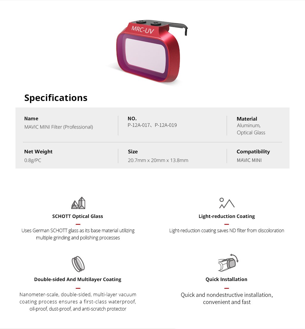 Если вы хотите улучшить отснятые кадры и видеоматериалы, рекомендуется купить оптический фильтр PGYTECH Mavic Mini UV Filter (Professional) P-12A-017, чтобы отснятое изображение было качественным и естественного цвета.