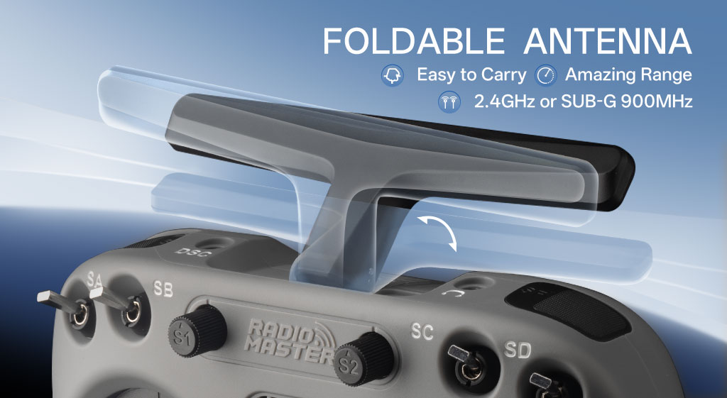 Складная антенна с усилением 2 дБ обеспечивает стабильный сигнал и оптимальный баланс между дальностью и энергопотреблением. Благодаря регулируемой мощности передатчика пользователь может адаптировать радио под конкретные условия: от полетов в помещениях, где важна экономия энергии, до полетов на большие расстояния, где приоритетом становится максимально надежная связь. Конструкция антенны складная, что делает ее удобной для транспортировки и хранения — достаточно сложить ее, и аппаратура занимает минимум места в кофре. При этом решение не влияет на качество сигнала, сохраняя высокий уровень стабильности даже в сложных условиях с помехами.