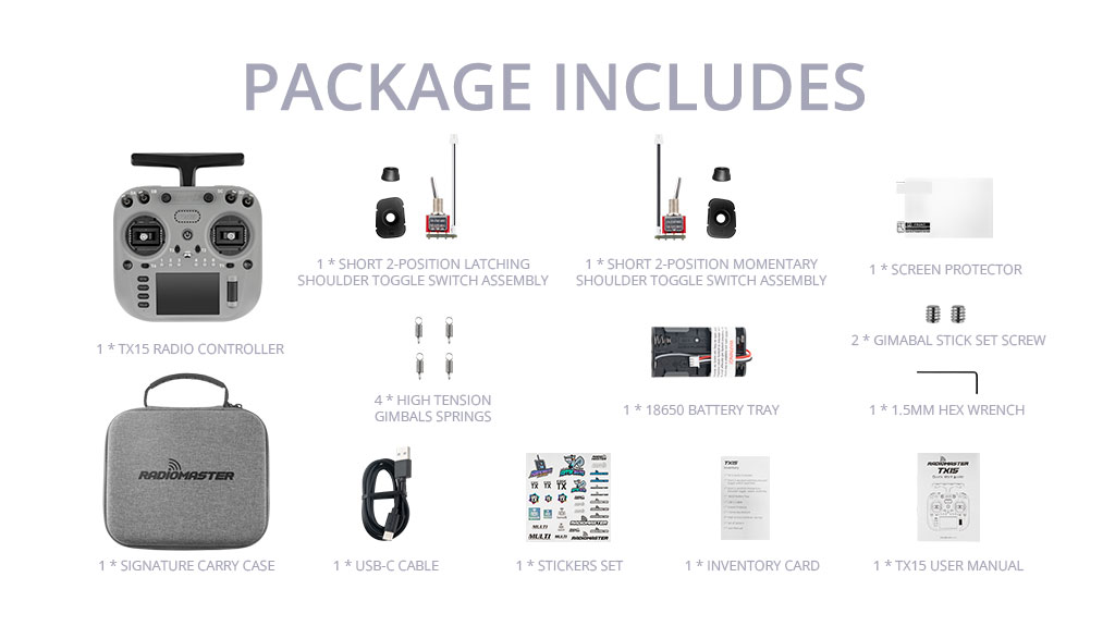 Еще одной особенностью являются сменные плечевые тумблеры, позволяющие гибко настраивать аппаратуру под индивидуальный стиль управления. Пользователь может выбирать между различными типами переключателей — фиксированными или моментальными, короткими или удлиненными — и таким образом получить максимально удобную конфигурацию для конкретных сценариев полета. Это особенно важно для FPV-пилотов, которые ценят точность и мгновенную реакцию под пальцами.